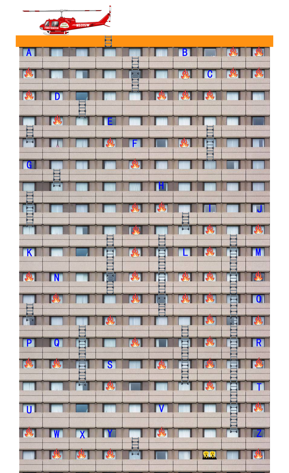 用最快速度,把被困人员救出来。千万不要进入着火的房间。注:楼道和走廊都被烟雾充斥了,好在同一层的相邻房间之间也是相通的。并且还有一些消防梯子可供在楼层间移动。还有一个坏消息是,只能使用固定的26个灭火装置,且必须到达所在位置才可启动。一台装置启动后,可以灭掉正下方房间的火。