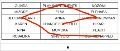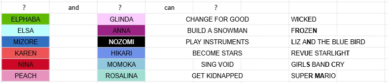 首先把左边的三列填满,左两列填入角色(按照应援色/印象色)第三列填入和两位角色有关的一件事,在空栏上填入原作品。